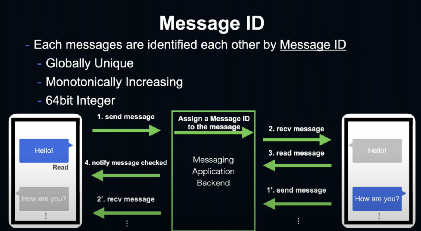 - 메시지가 발행될때에는 ID 가 없고, 서버에서 메시지를 받았을 때 ‘서버에서 ID를 채번’ 그리고 그 ID를 다시 클라이언트에게도 보내준다.