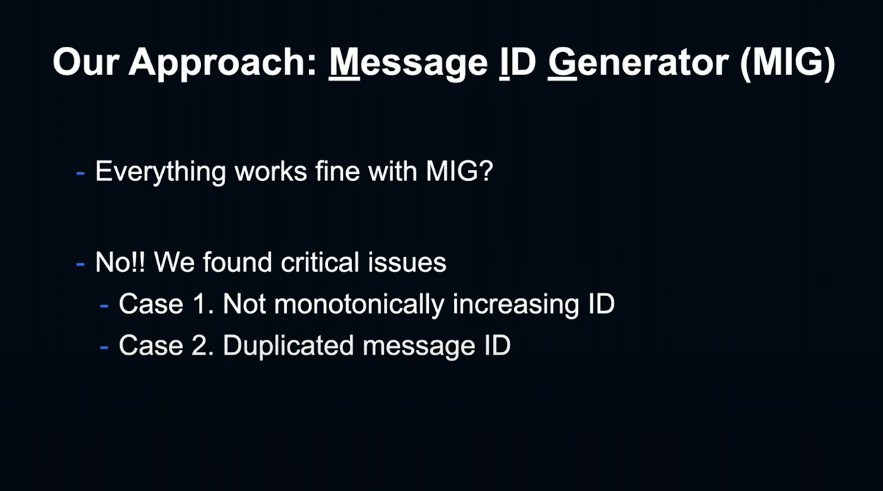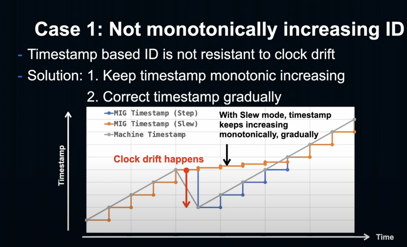 clock drift(backword) (주: 나는 if (current < lastTimestamp) 이렇게 에러 로그만 찍고 있다. 이걸 throw exception 하고, 아마 retries 에 의해 다른 MIG 가 채번을 하겠지. 그 동안 이 인스턴스는 ID 생성을 하지 않는다. 그래서 '언젠가는 monotonic 하게 다시 동작할 것이다')